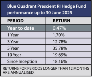 The Blue Quadrant Capital Growth Prescient RI Hedge Fund aims to generate sustainable real returns over the long term. Although it has a substantial equity bias, the fund’s mandate allows for some flexibility to diversify into other asset classes, including unlisted investments.