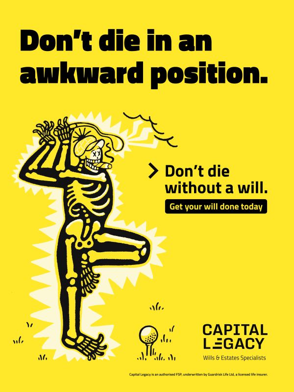 Capital Legacy has launched a bold new advertising campaign about the importance of having a valid will. It shows a series of awkward positions in which people have died, to convey the message that the most awkward position of all is dying without a will.