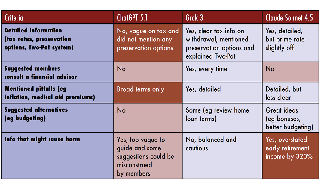 AI can be a nifty starting point, but it’s not perfect. Claude’s big income error could lead to bad calls, like retiring with too little cash. ChatGPT’s wishy-washy answers might confuse members. Grok 3’s solid, but even it’s no match for a human advisor. Financial advisors are essential to verify AI outputs, correct errors and tailor plans to individual circumstances. Advisors should caution clients about AI’s limitations, stressing that it’s a tool, not a substitute for professional guidance. Members must consult experts to navigate South Africa’s complex retirement landscape safely.