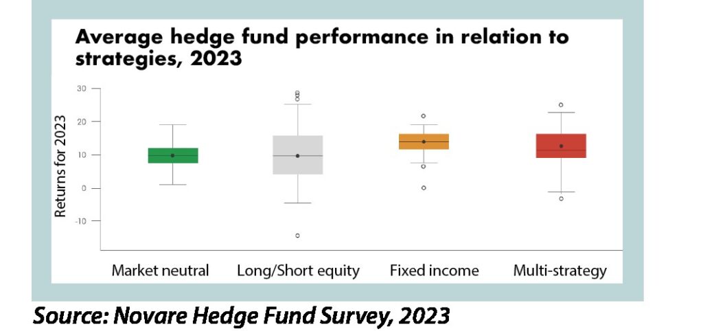 As one might expect, multi-strategy funds had a diverse return profile from 0% to over 20%, with the median return at about 10.8%. There are several high-end outliers, indicating that certain multi-strategy funds achieved exceptional results in 2023. This suggests that skilled managers were able to identify opportunities in different asset classes and capitalised on them. The strategy offers a balance between risk and reward by being flexible in allocation from equities to fixed-income instruments.