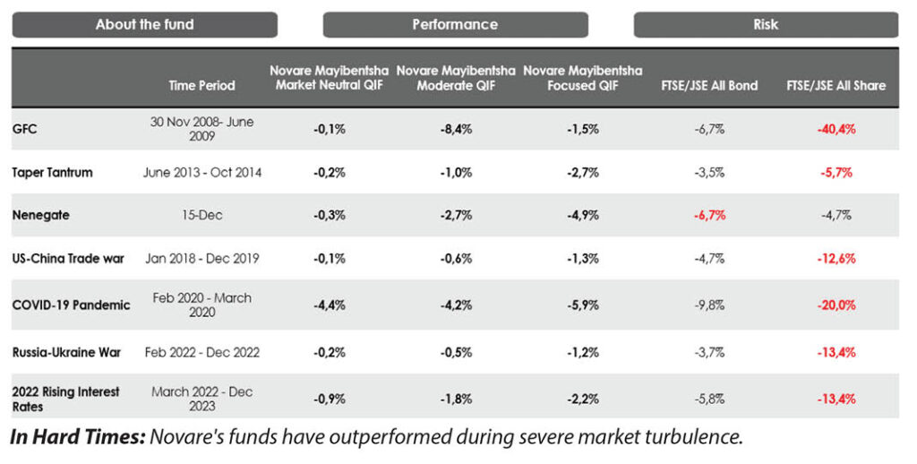 And it wasn’t a one-off. At Novare, we’ve seen our Mayibentsha range of funds of hedge funds outperform equities and bonds through nearly every major market shock since 2008, including the global financial crisis, Nenegate, Covid-19 and the post pandemic inflation cycle.
