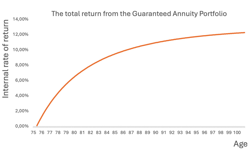 This implies that in our example, which is for a male aged 65, another investment needs to provide a net of fee return of close to 11% for decades to be able to provide the same income as the Guaranteed Annuity Portfolio would if the client lives to the age of 90.