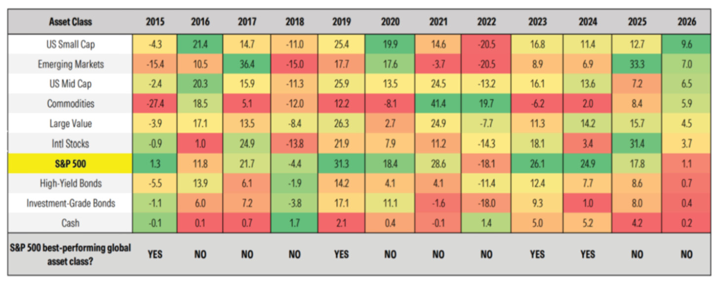 This is where today’s market environment becomes especially relevant. When returns become driven by a narrow part of the market, whether a handful of mega-cap stocks, one country, or one investment style, portfolios can quietly become riskier. No asset class, market, or manager outperforms all the time. History shows that leadership rotates, often when investors least expect it.
