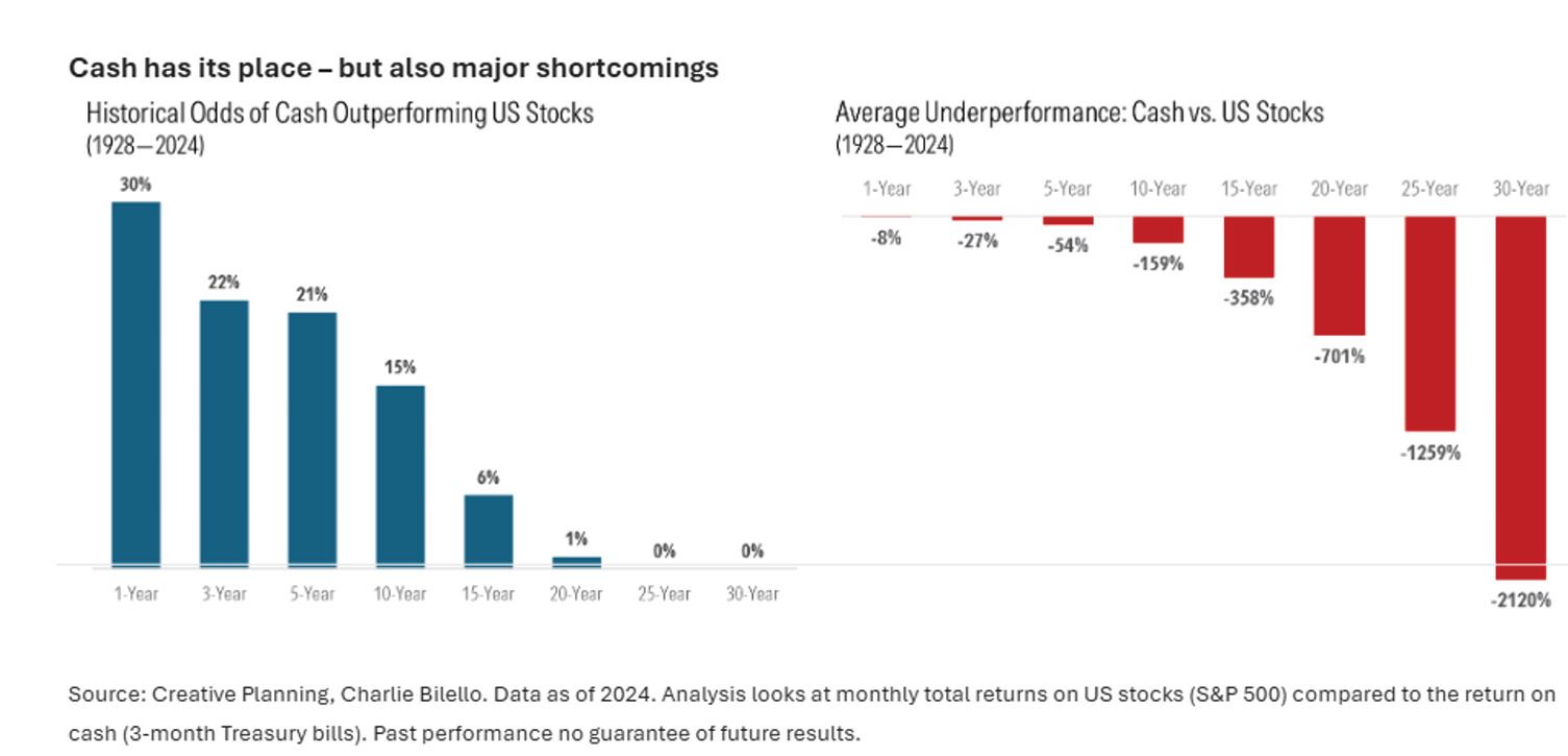 Source: Creative Planning, Charlie Bilello. Data as of 2024. Analysis looks at monthly total returns on US stocks (S&P 500) compared to the return on cash (3-month Treasury bills). Past performance no guarantee of future results.