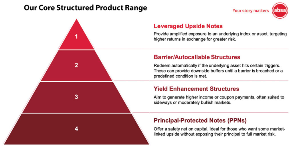 Frequent issuance – At Absa Index and Structured Solutions or AISS, we offer new structured products on our “shelf” each month, giving investors opportunities to invest in market-linked structures as conditions evolve.