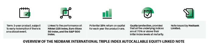 In South Africa, commonly used structures include capital-protected notes, autocallables and geared strategies. Some providers, including Nedbank, also offer structured credit and monetised solutions for more sophisticated investors.