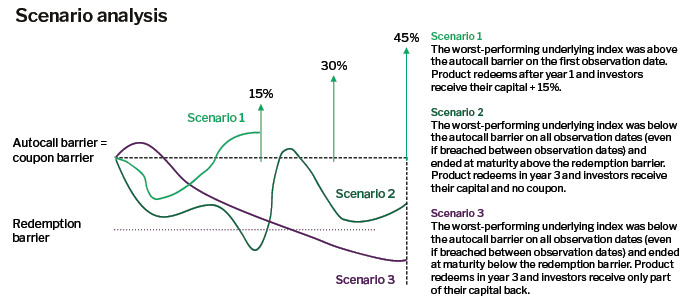 Autocallable notes are suited to markets expected to be stable or moderately stronger. These structures include observation dates and trigger conditions that may result in early maturity with a predefined coupon. Coupons can accumulate (snowball), and downside barriers help determine capital outcomes at maturity. Advisers must clearly communicate stress scenarios, particularly markets drifting lower without breaching barriers or meeting call triggers.